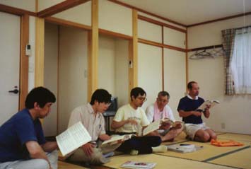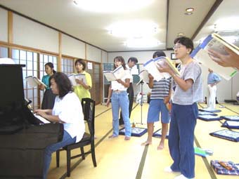 男声部はリーダーのキーボードに併せて音取り練習中。 正座して 御詠歌を唱えているのではありません。 以前の合宿ではキーボード代わりに鉄火鉢を鉄火箸でたたいて練習したことも。 あのカンカンと言う音が思い出されます。
